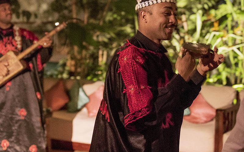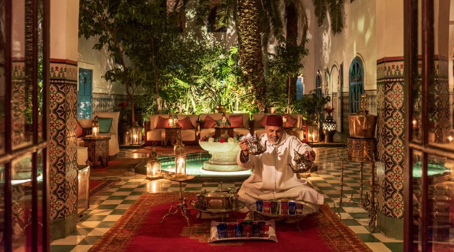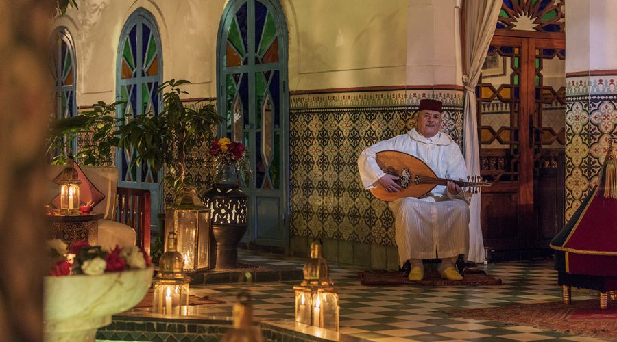 Le dîner est servi dans deux salons au rez-de-chaussée. Dans un menu unique, vous dégusterez certains plats d’origine de Fez. Les serveurs sont vêtus de rouge et de noir. Au cours du dîner une animation d’un duo de gnawa (musicien traditionnel marocain descendent d’ancien esclave noir), vous feront entendre des airs lancinants et envoûtants, vous finirez votre soirée sur une traditionnelle danse orientale.